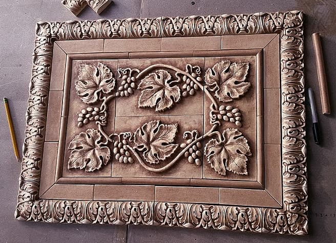 The Grape Vine tile comes in 9 pieces and measures 15 1/4 x 17 1/4" in size. The relief is more shallow that many of our other designs. This will make cleaning a little easier. All of these pictures show the tile with Plain Frame liners, but the tile itself has a raised edge, making additional framing unnecessary.