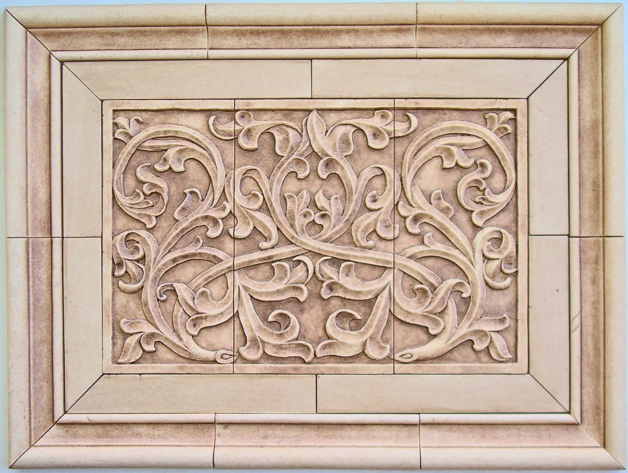 The three piece Lion tile is 14 1/8 x 20 7/8" The design is more intricate then many of our other tiles. The Lion itself rises over an inch from the suface of the tile. Typically used with a Bouquet tile on either side as seen in some of these pictures. The 6 x 6 Lion Face tile can be used as a complementary tile for a Lion and Bouquet set or used alone as a smaller design feature.