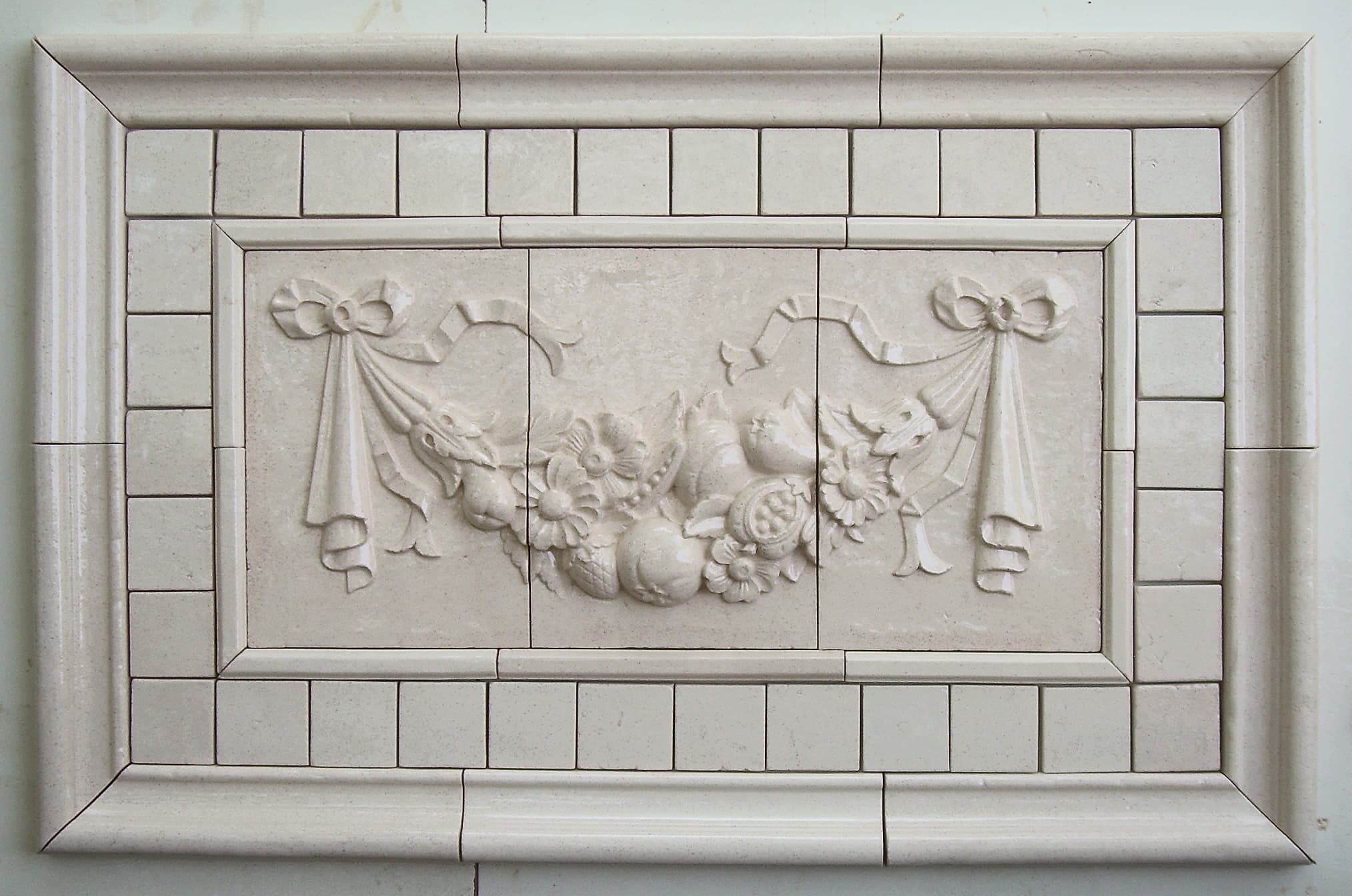 Fruit Garland 9 1/4 x 19 1/2" This is a unique tile due to the fact that the pattern rises almost an inch form the surface of the tile. This classic image can be seen on many turn of the century building exteriors. Look up images of the Detroit's abandoned Central Train Station or the Chicago Cultual Center.